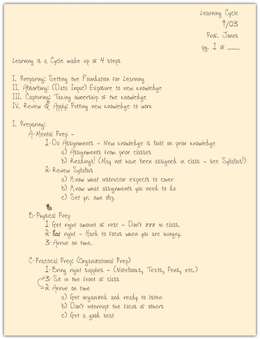 Everybody takes notes, or at least everybody claims to. But if you take a close look, many who are claiming to take notes on their laptops are actually surfing the Web, and paper notebooks are filled with doodles interrupted by a couple of random words with an asterisk next to them reminding you that “This is important!” In college, these approaches will not work. In college, your instructors expect you to make connections between class lectures and reading assignments; they expect you to create an opinion about the material presented; they expect you to make connections between the material and life beyond college. Your notes are your roadmaps for these thoughts. Do you take good notes? After learning to listen, note taking is the most important skill to ensure your success in a class.